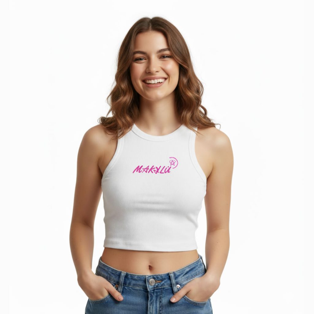 ¡Vibra alto con la Tank Top oficial de Makylú en blanco! Con un diseño que captura su esencia y la frase ‘Conquistando Corazones’ en un fucsia vibrante, estarás lista para brillar. ¡El must-have para lxs verdaderxs fans que aman el estilo y la frescura!